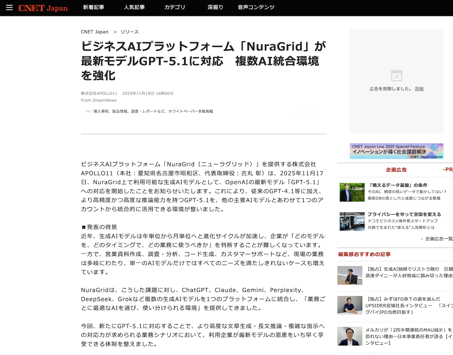 NuraGridがGPT5.1に対応。CNETにて取り上げてられました。